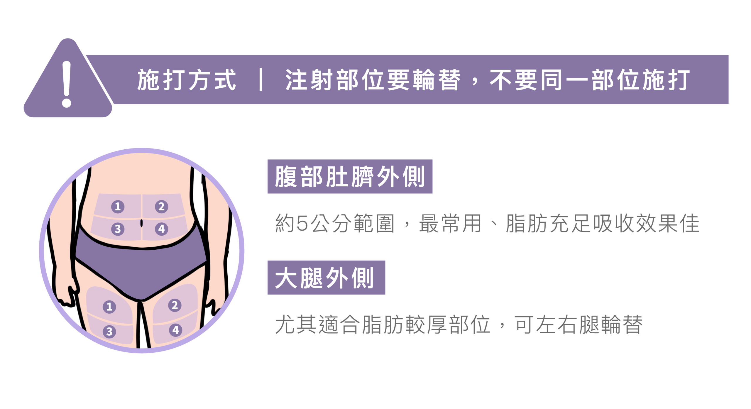 - 部位:腹部、大腿外側或上臂後側。