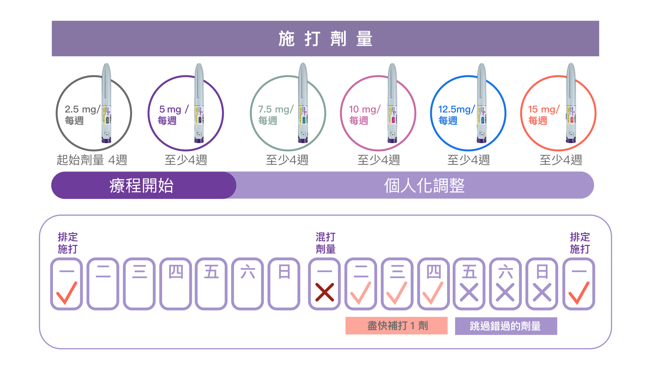 - 頻率:每週固定的同一天,皮下注射。